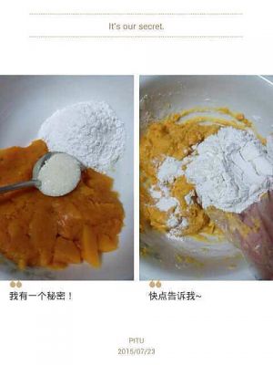 蒸好的南瓜趁热加热白糖碾成泥,加入元宵粉揉成面团(粉不要一次性加入,慢慢加噢)
