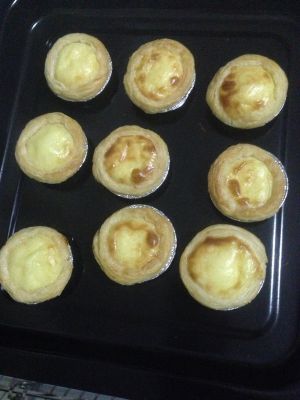 将挞液用勺子注入到挞皮里 九分满即可 烤箱预热后 将烤盘放置在烤箱中层 选择上下烘烤 180度 20分钟 然后就等待完成时叮的一声吧
