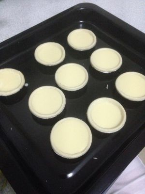 烤箱预热5分钟,用勺子将挝液装入挞皮8分满,放进预热好的烤箱。