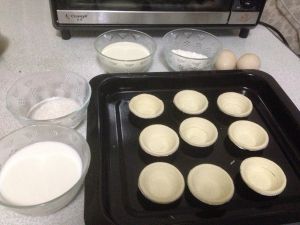 准备好原材料 淡奶油120g 牛奶120g 糖30g 蛋挞皮18个 (这里没拍全 )鸡蛋2个 低筋面粉15g