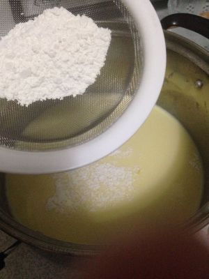 奶液凉了加入蛋黄拌均,再加入过筛的低筋面粉拌均。