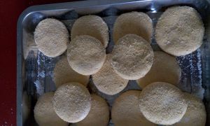 3.把揉好的面团分成小块,压成饼的形状,黏上面包屑。