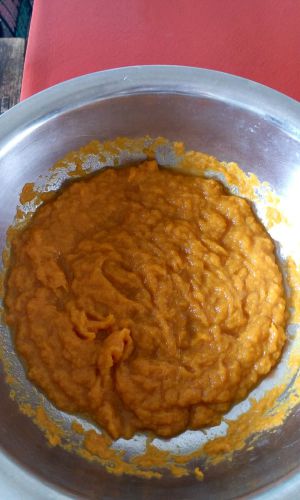 南瓜蒸好后,倒进盘内,加入糖用勺子压成南瓜泥