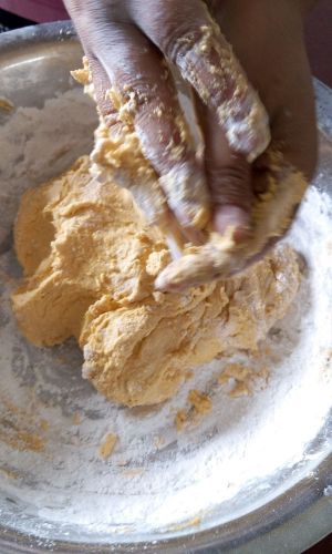 2.将糯米粉加入南瓜泥,揉捏成面团。