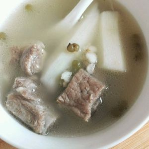 将绿豆、薏米与猪肋骨一同下锅,加刚好没过食材的水。炖大约半小时。半小时后会发现汤已经有了绿豆色。