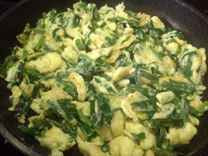 把菜倒入热油中,用筷子轻轻搅动,使韭菜鸡蛋形成一块块,微黄时出锅!