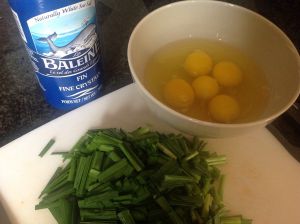 在鸡蛋里加少许盐和少许水(这样鸡蛋比较嫩,不会太干)搅匀加韭菜
