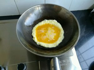 锅中油加热,将搅碎的鸡蛋放入锅中,鸡蛋煎至淡黄色,关火盛出备用