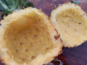 在菠萝的1/3处切开,把果肉掏出来,切成小块,放在碗里