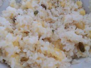 把融化的黄油、蒸好的糯米、切块的菠萝和葡萄干放一起搅拌~