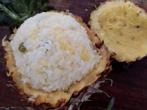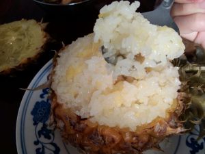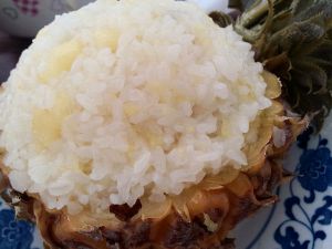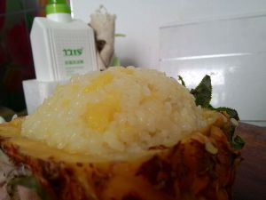 把中间掏出来,掏出来的菠萝和泡过糯米一起先蒸熟,把蒸熟的菠萝米饭放回空心菠萝回笼蒸5分钟,搞定