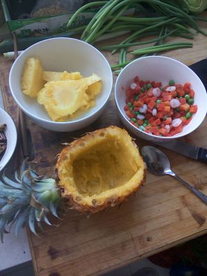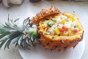 胡萝卜切丁,然后与青豆虾仁下水焯熟,掏出菠萝肉切丁,备用。 然后热锅放椰子油,然后倒入熟的青豆虾仁胡萝卜还有菠萝丁,翻炒一分钟,放米饭,炒散,出锅前撒一点盐,盛入挖空的菠萝壳中,美味的低脂菠萝饭就做好啦。