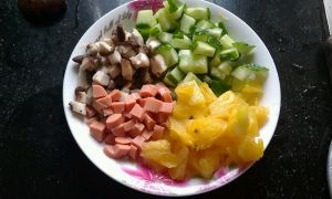 米饭蒸熟,黄瓜、胡萝卜、菠萝切碎。