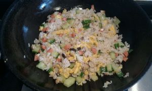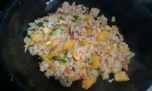 鸡蛋炒熟,出锅切碎待用,把切碎的黄瓜、胡萝卜及豌豆放入炒锅中翻炒,两分钟后加入菠萝,把米饭放到炒锅中,改小火不停翻炒,放入鸡蛋,撒上少许盐就可。