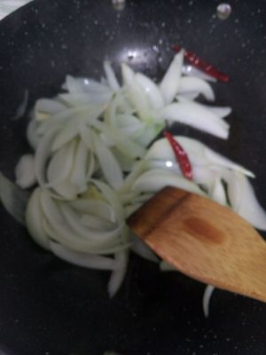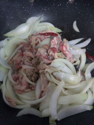 热油,下洋葱翻炒2-3分钟。再下羊肉一起炒。