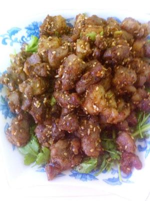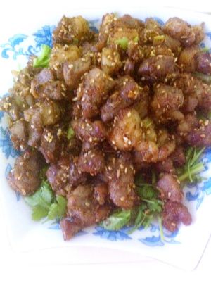 另起一锅,放油少许,下葱姜爆香,放入羊肉,依次放蚝油,孜然粉,孜然粒,芝麻,盐,大火翻炒,喜欢辣的可以再放点辣椒粉,调料均匀包裹住肉后即可出锅了