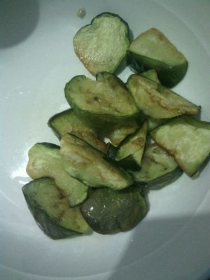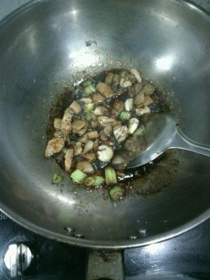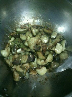 茄子过油,炒软后,把葱姜蒜放入,然后将配料调成汁倒入锅中。