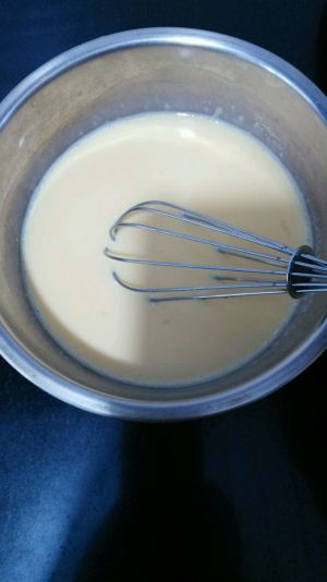 鸡蛋打散,加牛奶120克,炼乳,糖粉和小碗里的吉士粉液调匀,过筛(过筛之后的蛋挞液烤制后比较细腻)烤箱200度预热