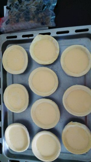 取出蛋挞皮放烤盘,倒入蛋挞液至8分满,可以加入水果丁,蜜豆等等