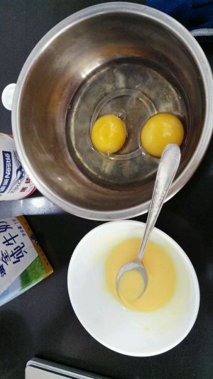 鸡蛋蛋清和蛋黄分离,把蛋黄加入拌好的牛奶液中(蛋清可以用来做蛋白酥,这样不会浪费)把蛋黄搅拌均匀,直至蛋黄全部融入牛奶液中
