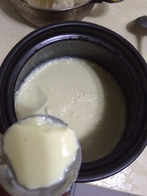 过滤好的豆浆放入砂锅煮沸腾,或者电饭锅煮开,冷5分钟,不再翻滚的时候,用10克冷水融化2克内酯(淘宝上有卖很便宜)充分融化后,一边搅动豆浆,一边一滴滴加入内酯水。然后盖上祸害闷25分钟,豆浆凝固成豆腐脑。豆腐脑可以吃哦
