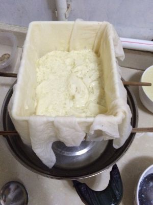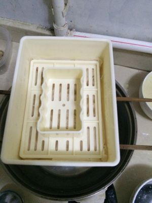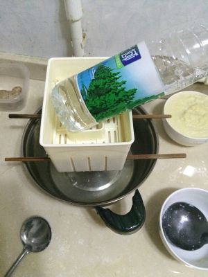 把纱布泡水然后平铺在豆腐模具或者淘米淘菜小网眼的漏筐里,把豆腐脑倒进去(因为豆腐脑是直接跟纱布接触,所以即使用漏筐也没事,豆腐脑不会漏掉的,漏筐网眼尽量小一些)
