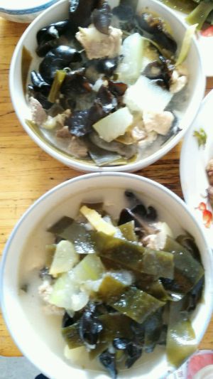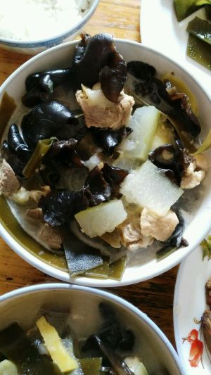 6.锅内放油,待热放入排骨生姜花椒小炒,不吃花椒的这里可以不放哦,炒出香味即可 7.锅内放适当水,开至大火炖排骨,至沸腾换小火,炖1个半小时 8.把木耳洗净撕片,海带洗净切成合适的大条 9.最后把海带冬瓜木耳放入排骨中炖,20分钟即可,如果不能分辨是否熟,就看冬瓜是否透明 10.尽情享用O(∩_∩)O
