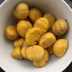 准备材料。煮开水后,熄火,将没有褪皮的栗子放入热水中,去皮。去皮后洗干净。