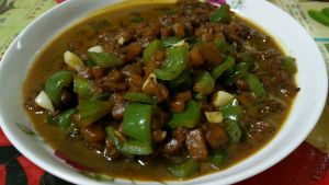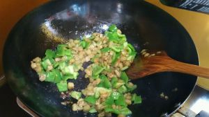 茄丁炒的差不多了的时候放入柿子椒丁,翻炒半分钟到一分钟