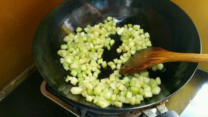 锅里放少许油(不粘锅!!!!这次忘记了!!!!)油热后放入切好的茄子丁翻炒