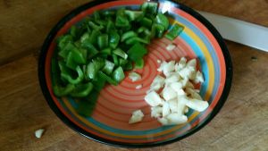 茄子去皮切小丁,柿子椒洗干净切小丁,都大概1公分内就好,要不容易茄子腥气去不掉,大蒜拍碎