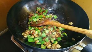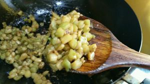 中火翻炒到茄丁焦黄,大概要两三分钟(也许更长,我没计时过),这个过程是一定不能太着急的,否则茄子会有腥气。。。。