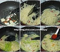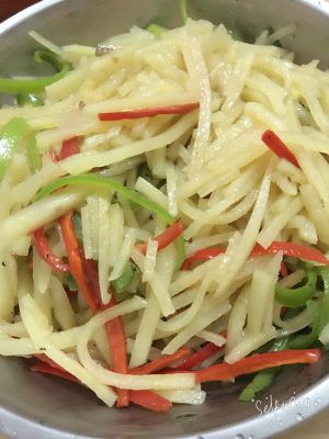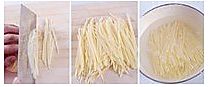 1:把土豆切成细细的丝,越细越好。过两遍冷水备用。