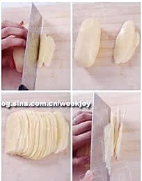 土豆切法:先在土豆长的一边切几片,使得成为一个平面,扣在菜板上,然后这样再继续切片,就稳定了,切土豆丝,也并非要求一定切多细,太细了一炒粘糊反而不好,只是要粗细均匀即可