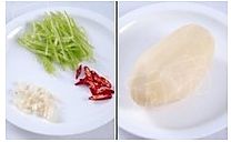 土豆洗净用刮皮刀刮去外皮,青辣椒切丝,小红椒切几下,蒜切碎