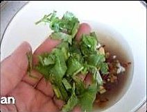香菜洗净切段,葱切葱花,蒜拍破,切成小蒜粒。