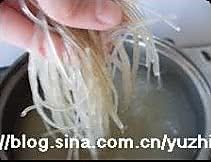 汤开后,放入红薯粉丝煮至透明,用筷子一夹就能夹断的时候(掌握不好可以捞两根粉丝尝一下,熟了就可以,千万别煮时间太长,粉丝煮时间长了就面了,没有了劲道的口感)。