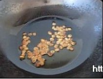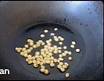 锅内放油,开小火,然后放黄豆(凉油的时候就放黄豆)。