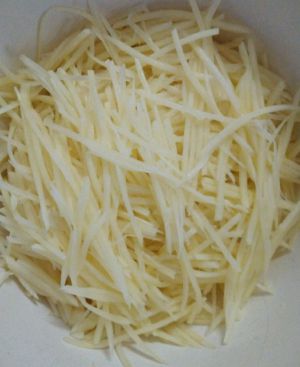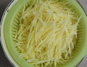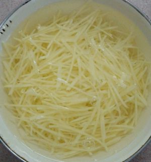 将土豆丝过滤清水2-3遍,滤去土豆中的淀粉。