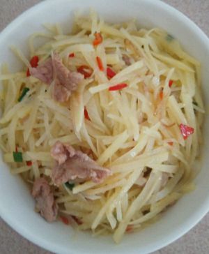 油加热七分左右,辣椒土豆丝一起下锅,翻炒。土豆丝稍微变软时,加入适量盐,一茶匙白糖,