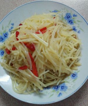 锅烧热放油,先下辣椒丝,再下土豆丝,翻炒……加入醋(醋的份量看个人口味),翻炒……加盐,翻炒……加水,熟了翻炒几下就可以出锅了。