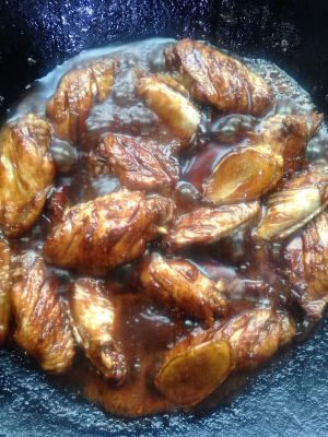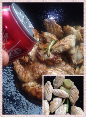 把炸好的鸡翅平底锅放一边。拿锅倒入刚炸多余油烧红。鸡翅倒入放大蒜姜。半瓶可乐即可。盖上盖子烧干。