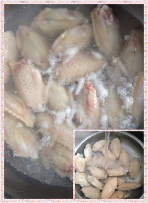 鸡翅洗净冷水下锅焯水,沸腾几秒后捞出,迅速放入冷水中冲洗干净。
