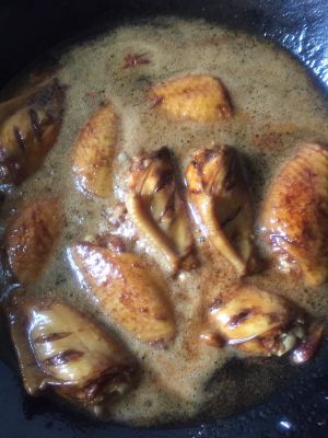 买腌制好的鸡翅中(数量根据人数而定),用油煎至两面泛黄