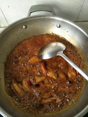 15分钟后开盖转大火,翻炒,收汁,看到没有颜色不要怕也不要猛下酱油耗油什么的,最后可乐收干了是很香很浓稠颜色很好看拌饭很好吃的酱汁。