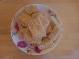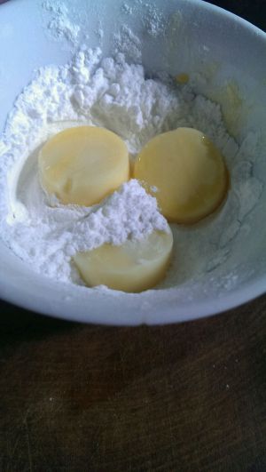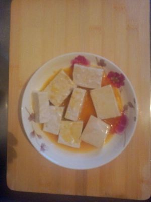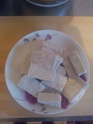 白玉豆腐切成块,放入红薯淀粉中裹上粉,图片上是未裹粉的
