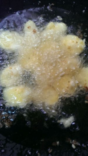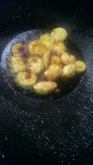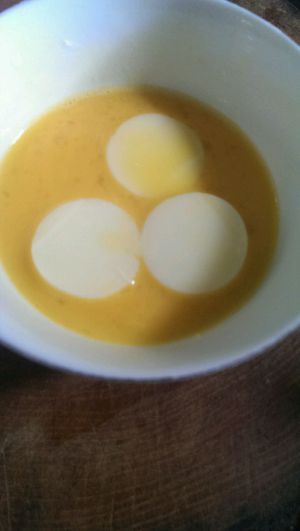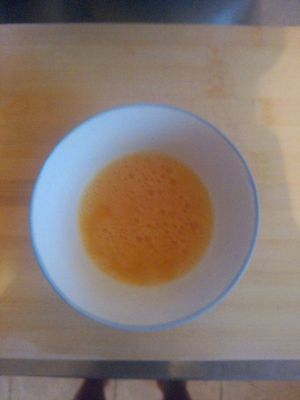 蘸好淀粉的豆腐在鸡蛋液里滚下,如下图