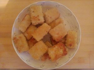 豆腐蘸好鸡蛋液后裹上准备好的面包糠,效果如图