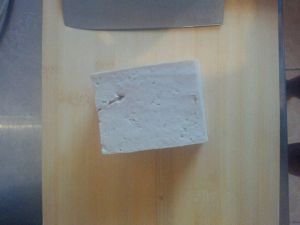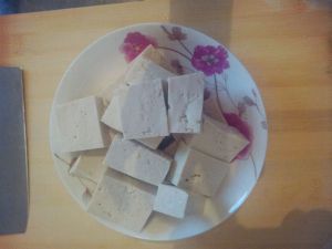 豆腐切块,送至烤箱或者微波炉"叮"10分钟,目的是让水气蒸发点,好下锅炸。