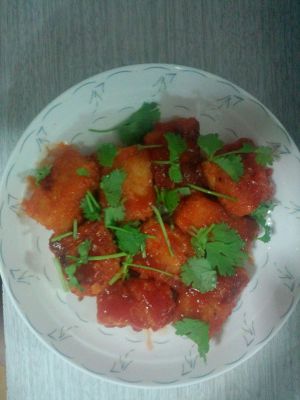 锅内留点底油,倒上番茄酱,加点清水,将煎好的豆腐倒入锅内,翻炒至番茄酱均匀裹在豆腐上,出锅装盘,撒上准备好的香菜